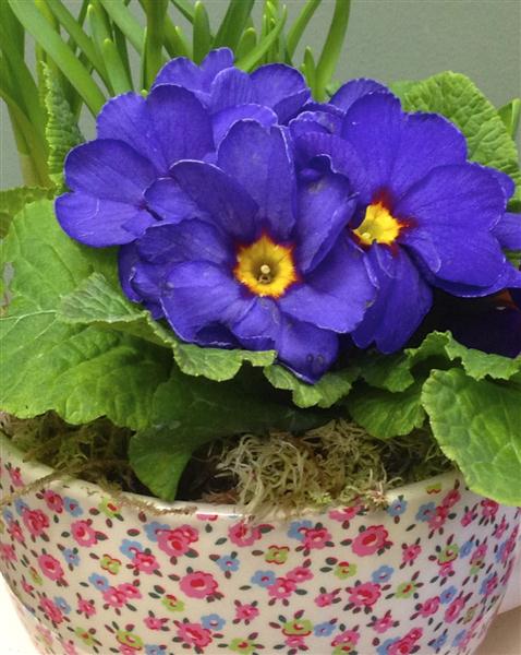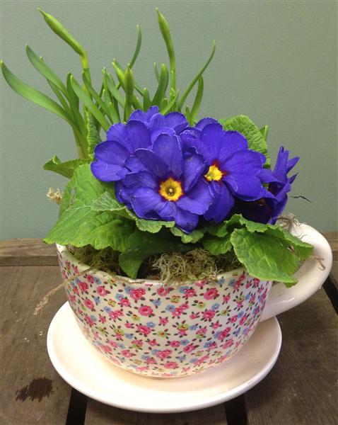 A sweet ceramic teacup and saucer filled with a selection of seasonal plants.