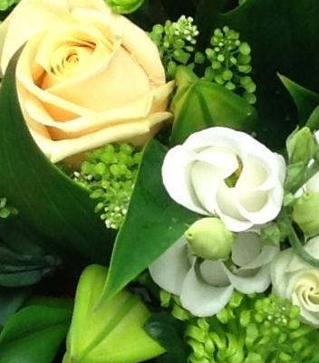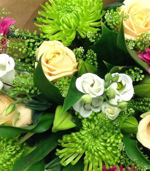 Lovely mix of fresh flowers, including roses, lisianthus, gerberas and green blooms.