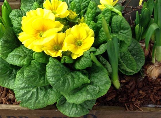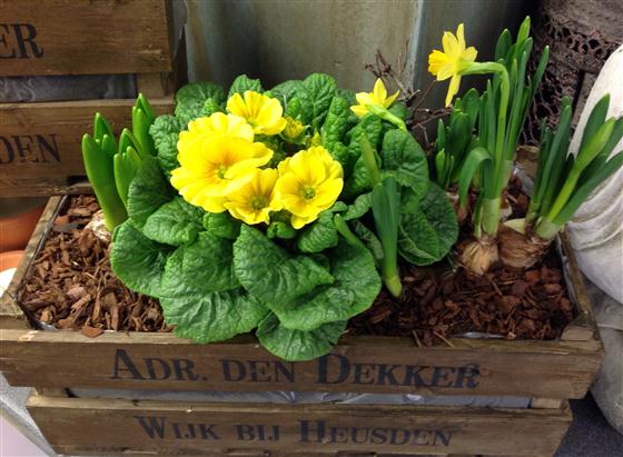 Antique style dutch crate filled with beautiful spring bulbs. Plants include hyacinths, tete a tete and a large primula. Colour of primula may vary.