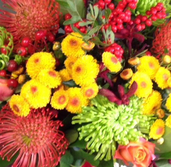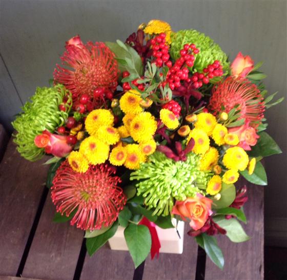 For a more exotic autumnal gift choose this vibrant hand-tied of proteas, shamrock blooms, roses and berries.
