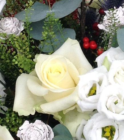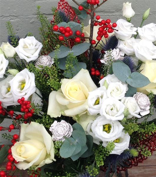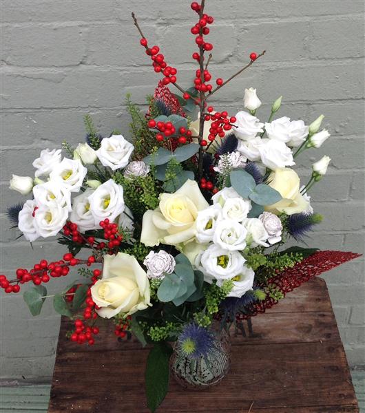 Ilex berries white lisianthus and white roses make this seasonal bouquet.