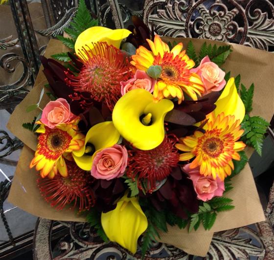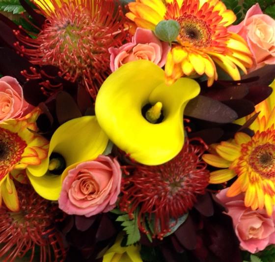 Bold vibrant array of Autumn colours. Including gerberas.