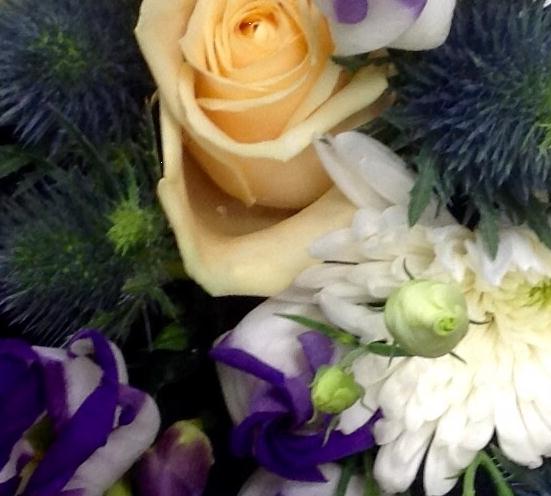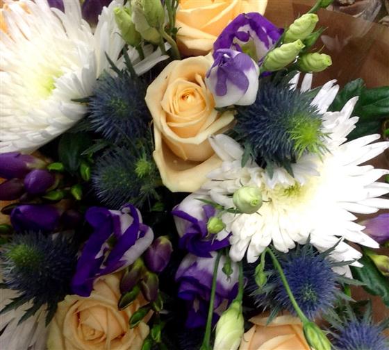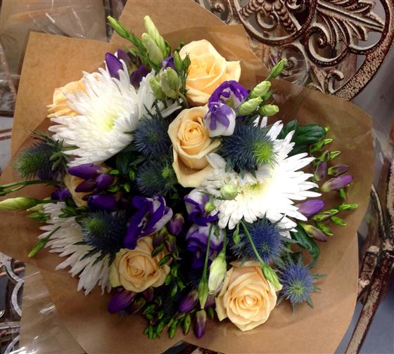 Lovely combination of blue, purple and peach. Including roses, lisianthus and other seasonal flowers.