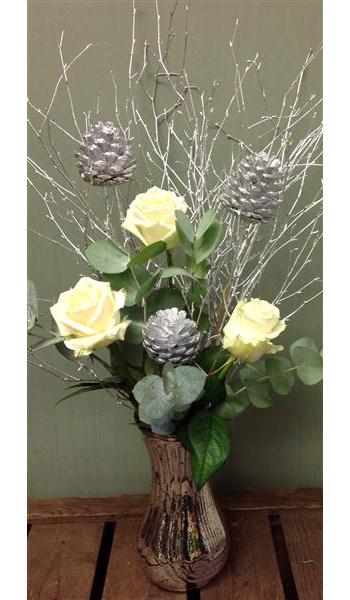 Silver vase display with white roses and silver twigs.