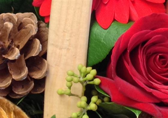 A christmas trug basket arrangement with rich red roses, berries and mixed dried fruits with cones and cinnamon.