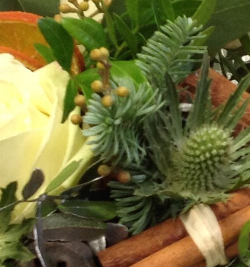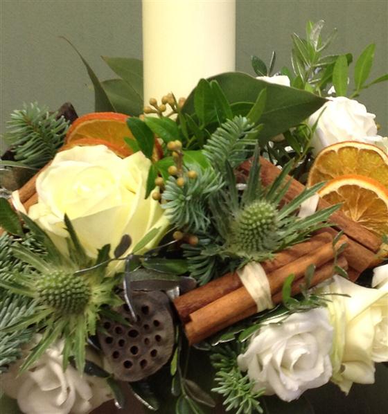 A delightful Christmas candle arrangement of spruce, cinnamon, eryngium, dried fruits and cream roses. A perfect Christmas table centrepiece.