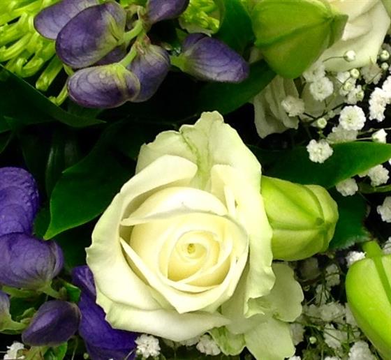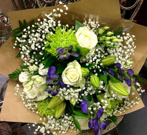 White roses, green chrysanthemums, lilies, gypsophila and purple aconitum make a classic all year round selection.