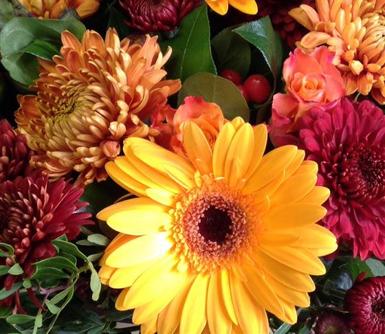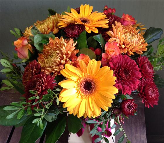 Autumn single chrysanthemum blooms, hypericum berries, gold gerberas and roses, create a warm autumn bouquet.