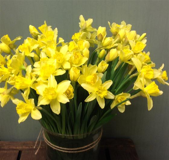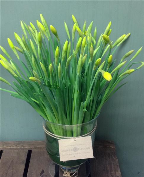 Stunning storm vase with 100 large daffs