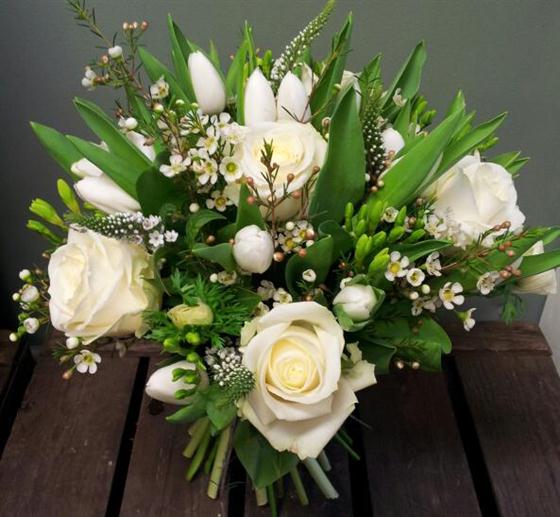 A simple, classic mix of white roses, tulips, wax flower and veronica presented as a hand-tied bouquet.