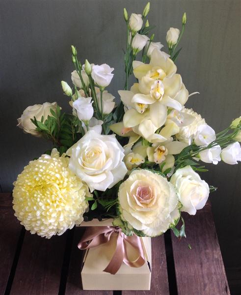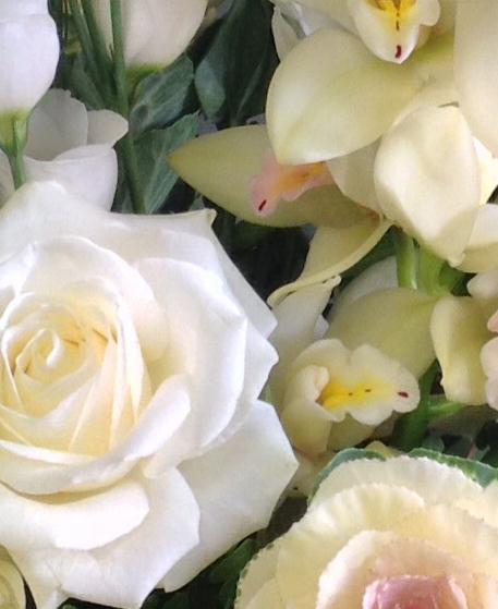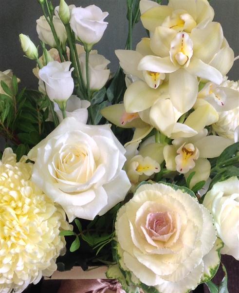 An unusual collection of blooms including roses, chrysanthemums, lisianthus and a single cymbidium orchid.