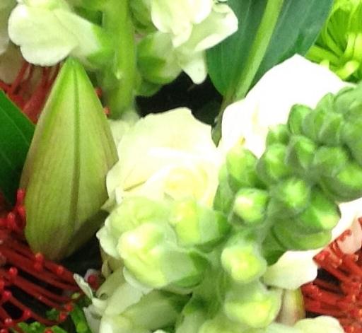 Orange protest nut are the main feature with roses, green blooms and other complimenting white flowers.
