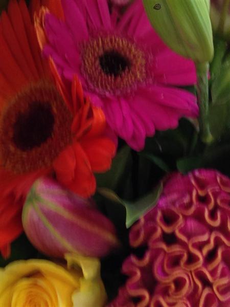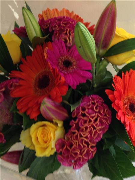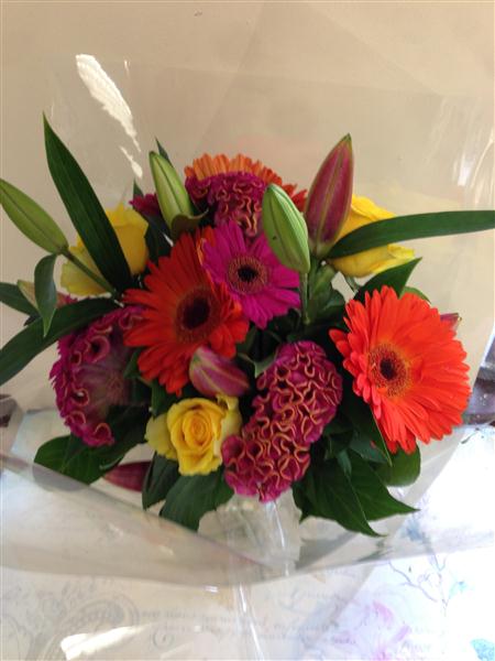 For a simple burst of colour choose this striking combination of gerberas, lilies and roses.
