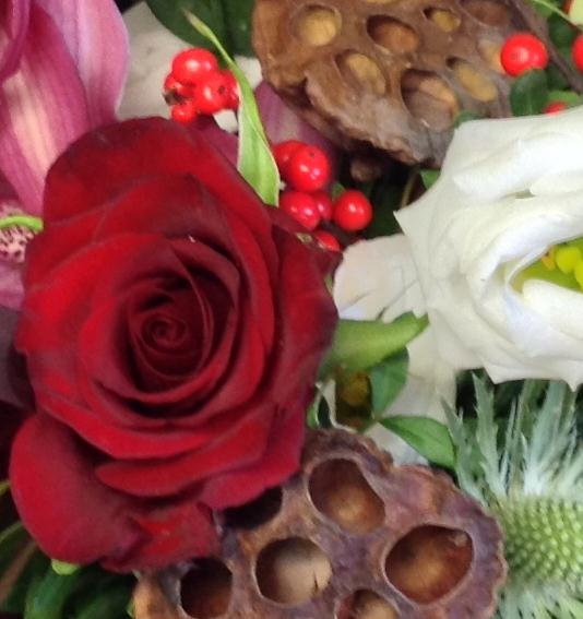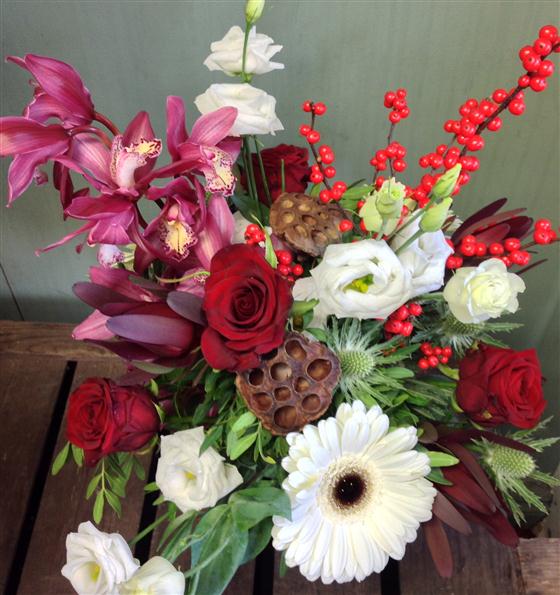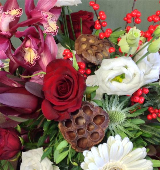 A stunning cymbidium orchid surrounded by a seasonal selection of blooms including ilex berries, red roses, gerberas and lisianthus.