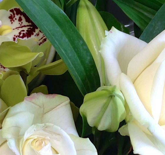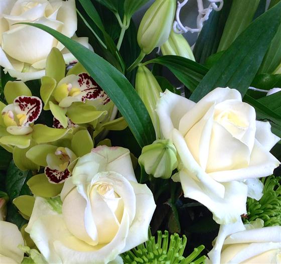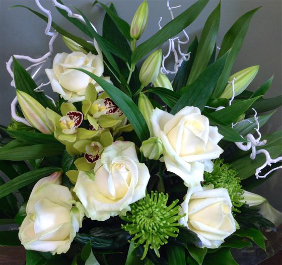 A classy and elegant bouquet of scented white oriental lilies, white roses, a magnificent cymbidium orchid and lime shamrock chrysanthemum blooms.