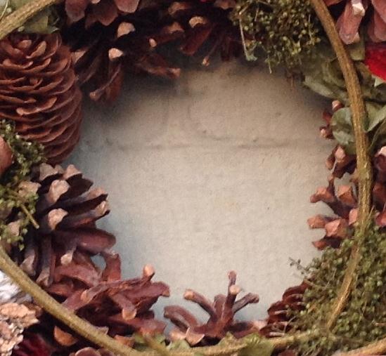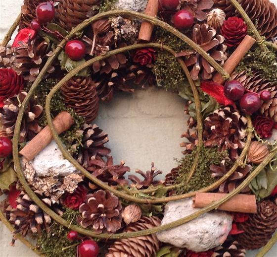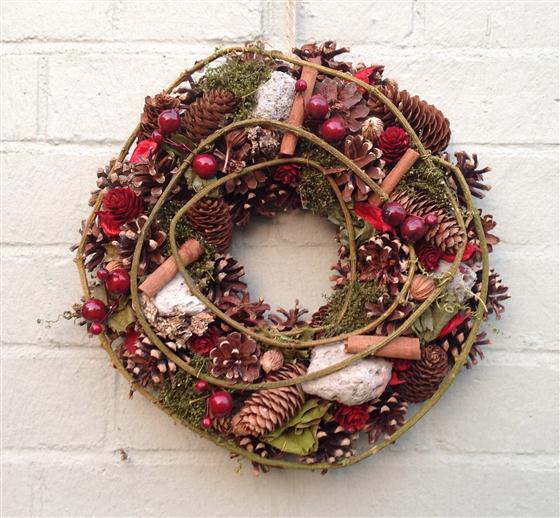 This christmas wreath is a dried, natural, everlasting design including cones, cinnamon sticks and artificial fruits.