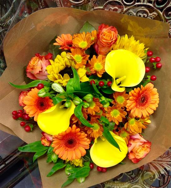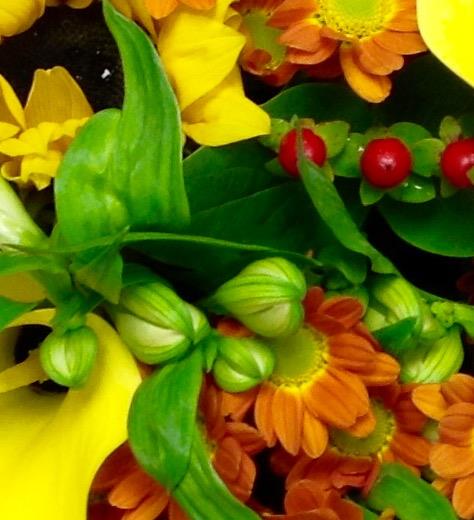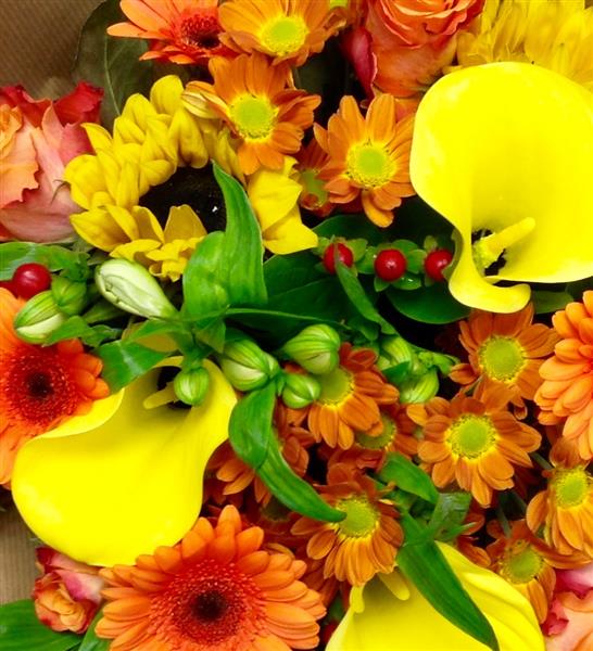 Bright and cheerful! Gerberas, sunflowers,roses and callas.