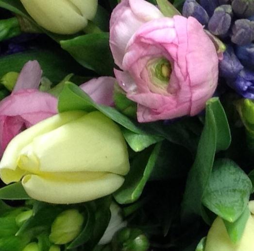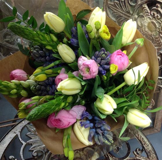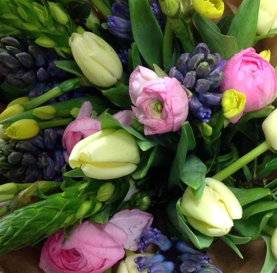 Lovely mix of spring flowers including tulips, narcissus and hyacinths.