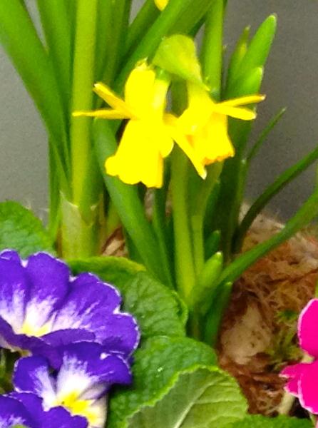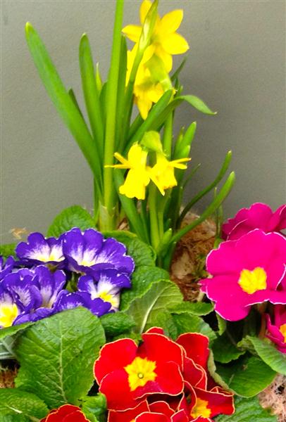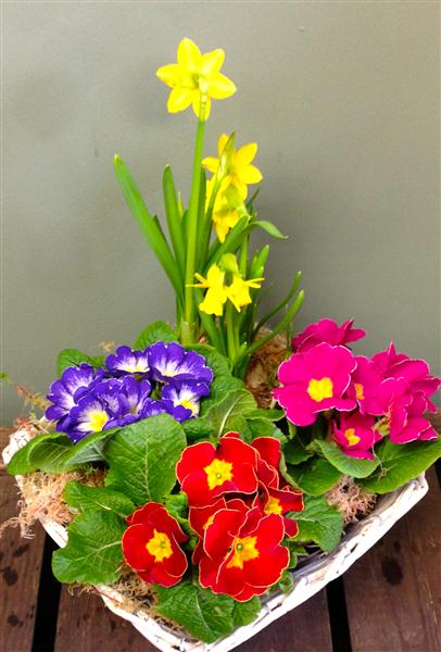 Planted basket of primulas and narcissus, a perfect long lasting spring gift.