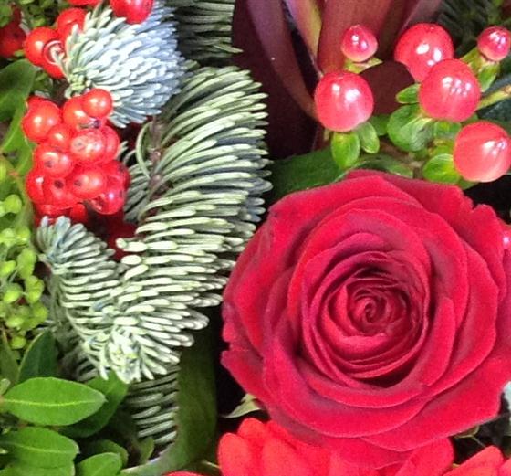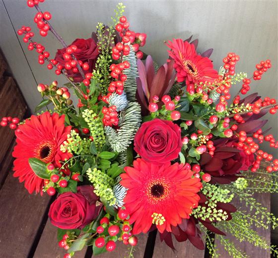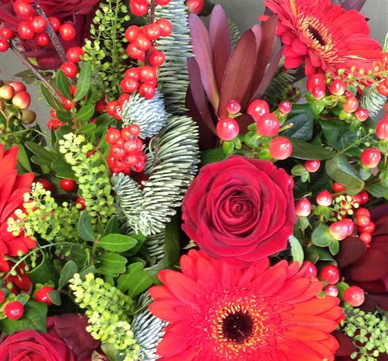 An opulent display or all red blooms, including velvety red roses, gerberas and berries combined with blue spruce for that scent of Christmas.