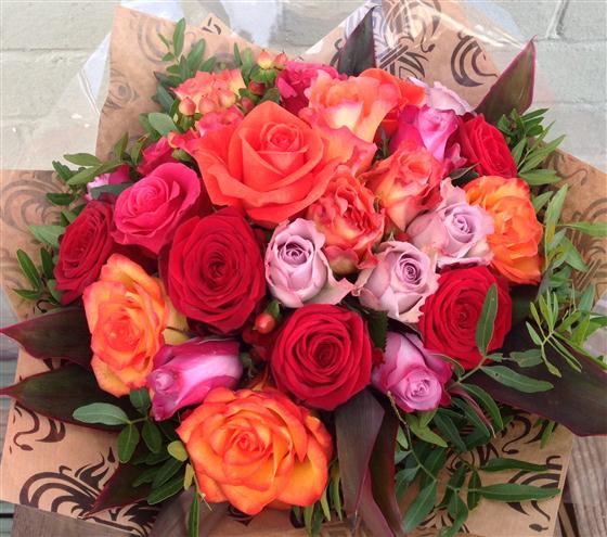 Hot mixture of all roses. This bouquet contains 25 roses