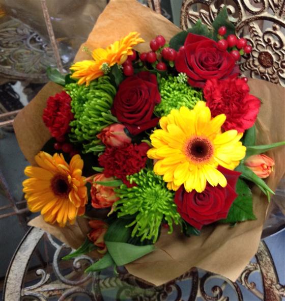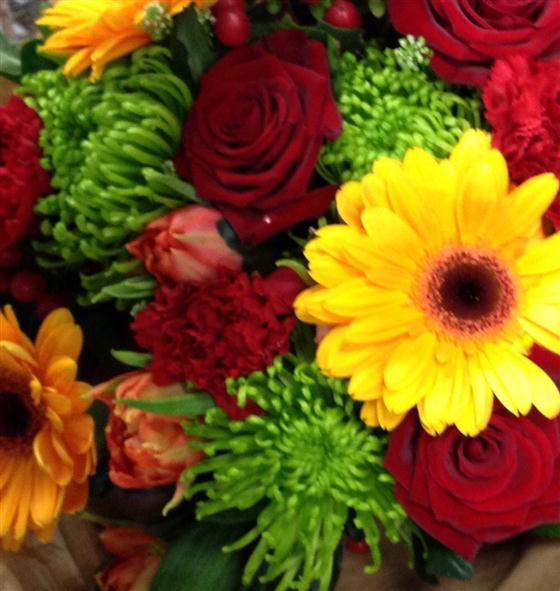 Warm and rich bouquet with gerberas, roses and green blooms.