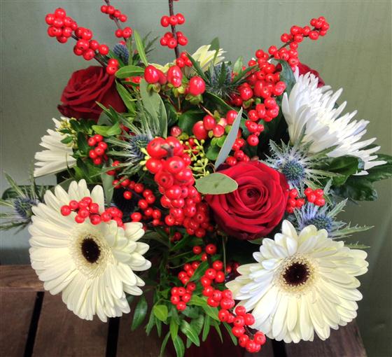 Celebrate Christmas with this wintery look bouquet of warming red roses and berries mixed with contrasting white gerberas and chrysanthemums.