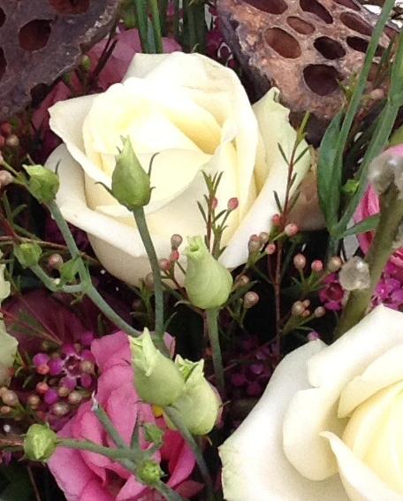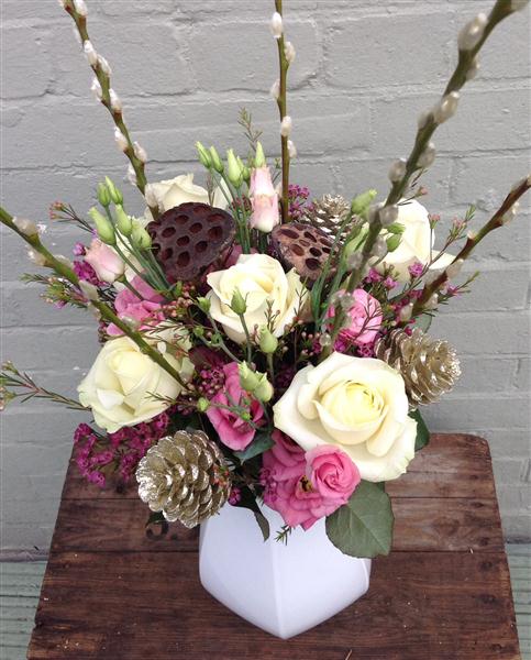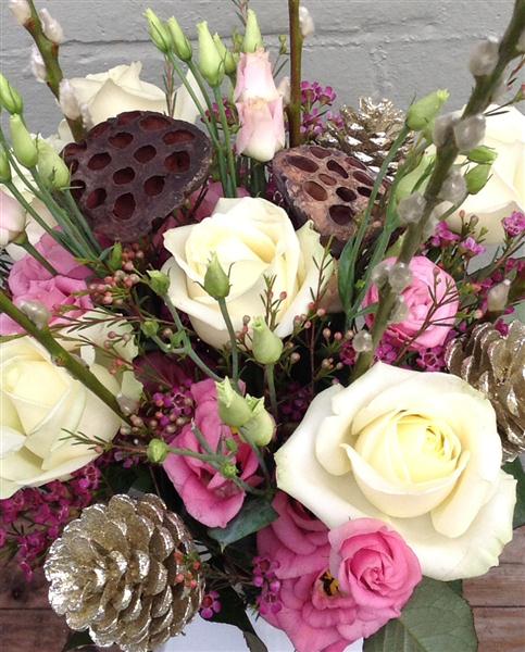 White roses pink lisianthus and pussy willow with complimenting gold Christmas cones.