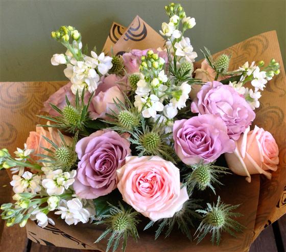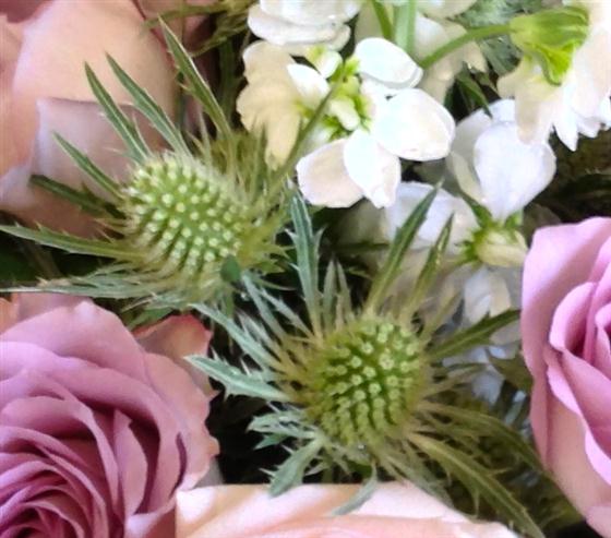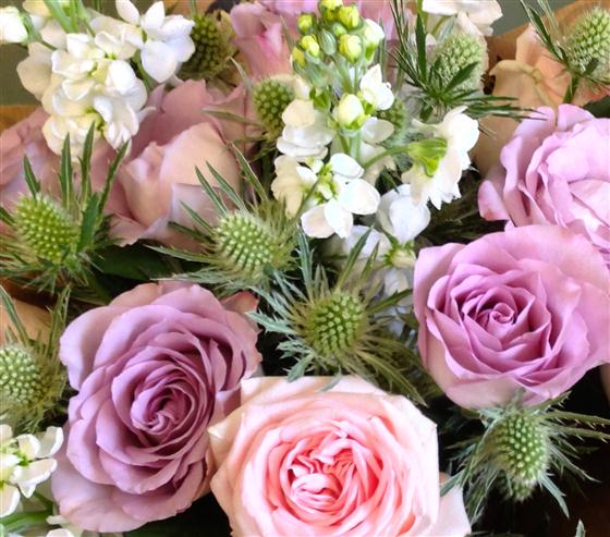 Soft and delicate two tone roses combine with scented white stocks and contrasting eryngiums for a truly vintage look.