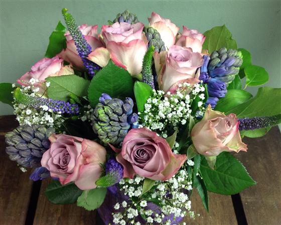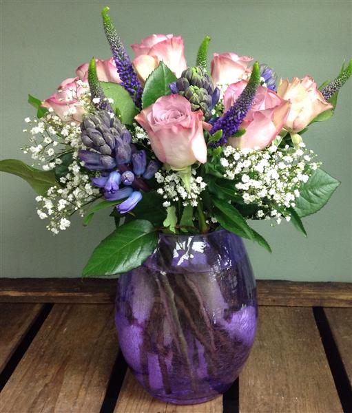 Lilac crackle vase display with memory lane vintage roses and blue hyacinths.