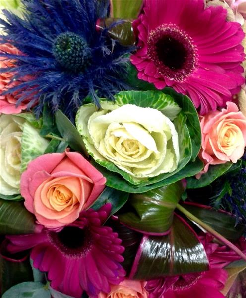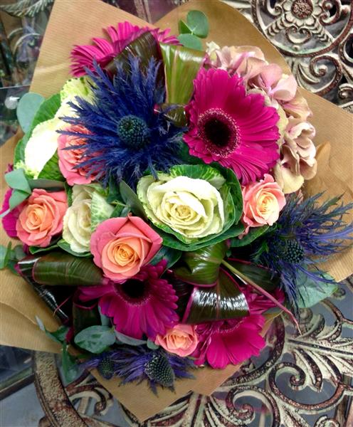 Lovely mix of roses, thistles and gerberas.