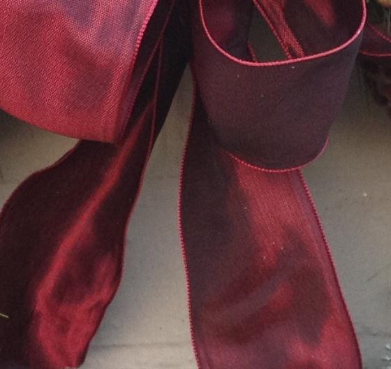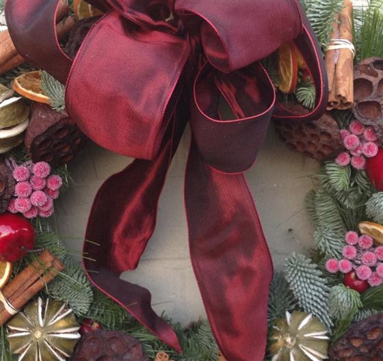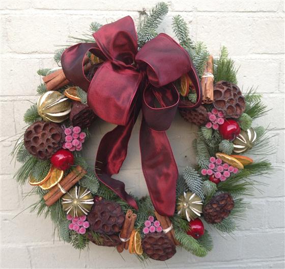Offer your guests a warm welcome with this beautiful, fresh pine wreath with a large, dark red satin bow, cinnamon, lotus heads and fruits.