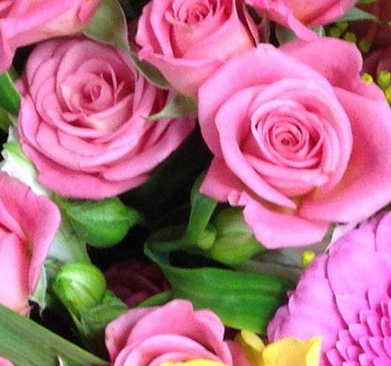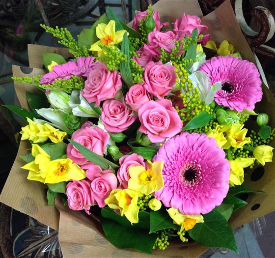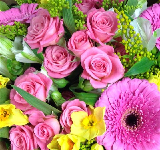 Vibrant bouquet in pink and yellow. Includes roses, gerberas and narcissus.