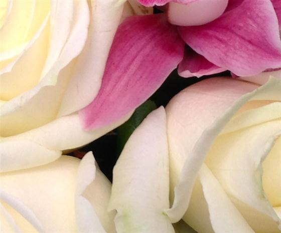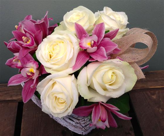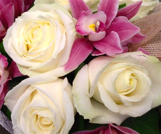 A dainty arrangement of cream roses and long lasting cymbidium orchids.