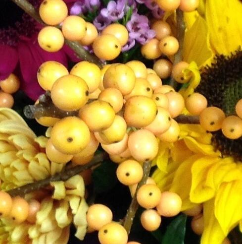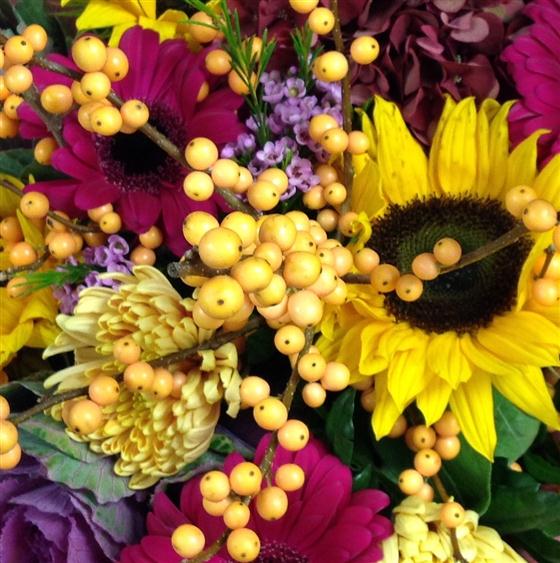 Stunning selection of sunflowers, berries and cerise gerberas.