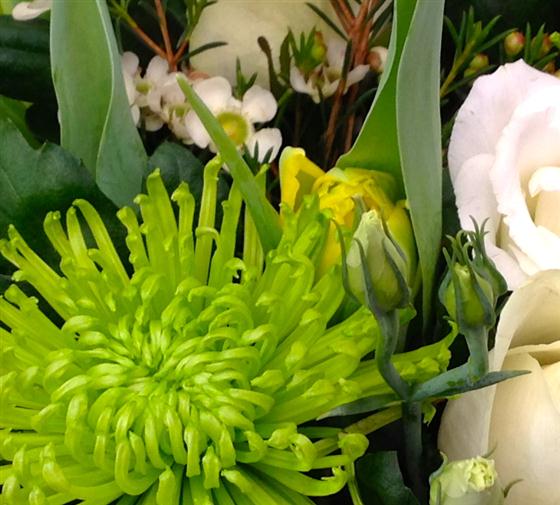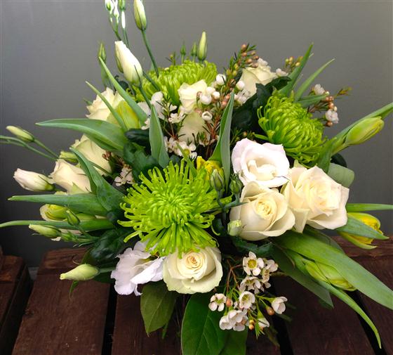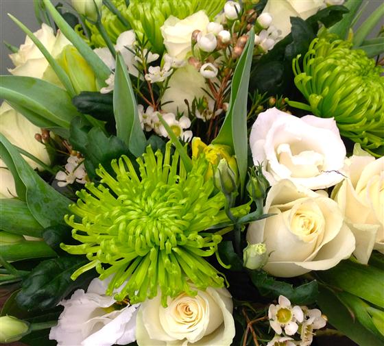 Shamrock lime green chrysanthemums compliment this crisp display of white and green blooms with a subtle hint of yellow. Including roses, lisianthus and wax flower.