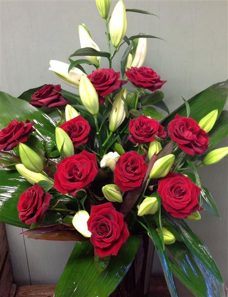 Stunning large black vase display of a dozen red roses and white oriental lillies. Deluxe option contains 24 red roses