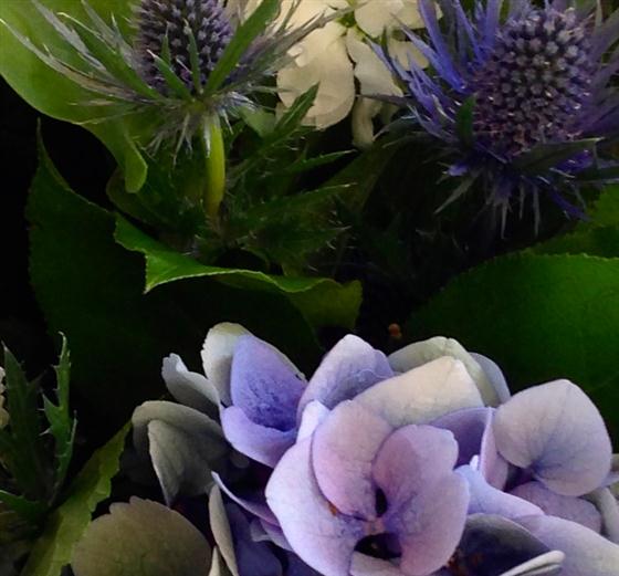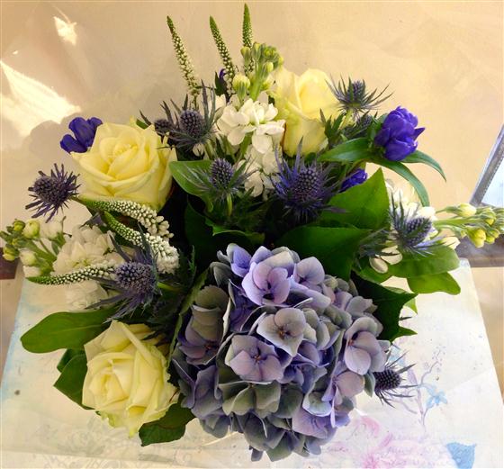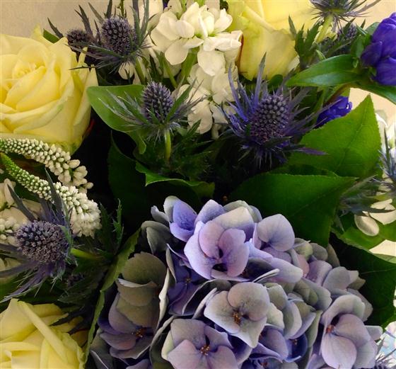 A skilfully combined selection of blue, cream and white flowers including gentians, roses, veronica and stocks. Perfect for any occasion.