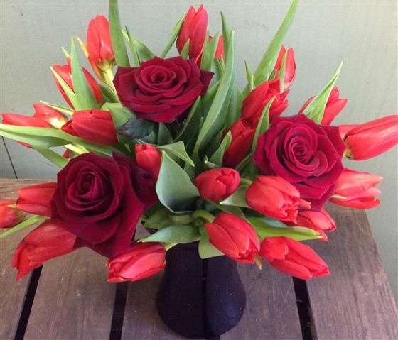 Vase display of 20 red tulips and 3 red roses. Large option contains 6 red roses. Deluxe option contains 12 red roses