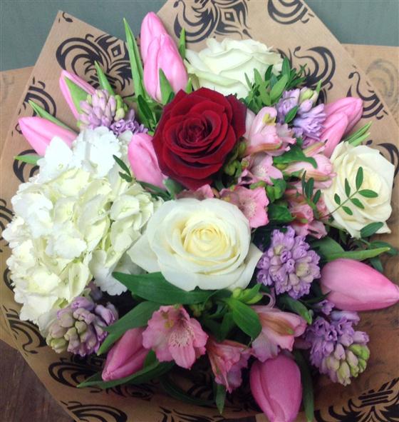 Pastel combination of tulips, hyacinths, white roses and a single red rose.