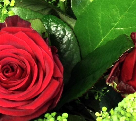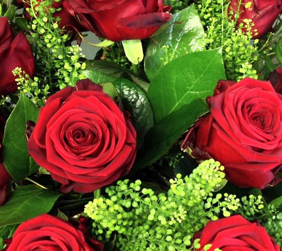 A dozen beautiful velvety red roses presented encased in a range of unusual foliage. A classic romantic gesture.