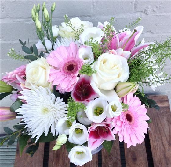 Perfect pink and white array of roses, lilies, lissianthus, chrysanthemums blooms and gerberas. Perfect for any occasion.