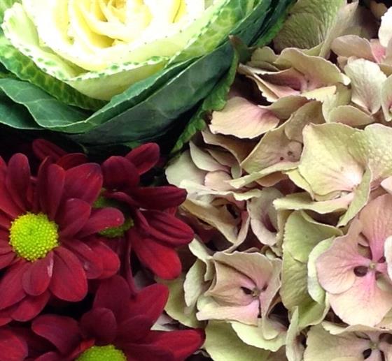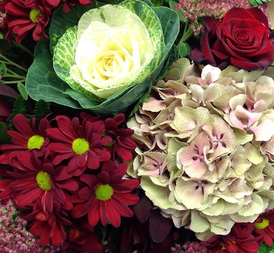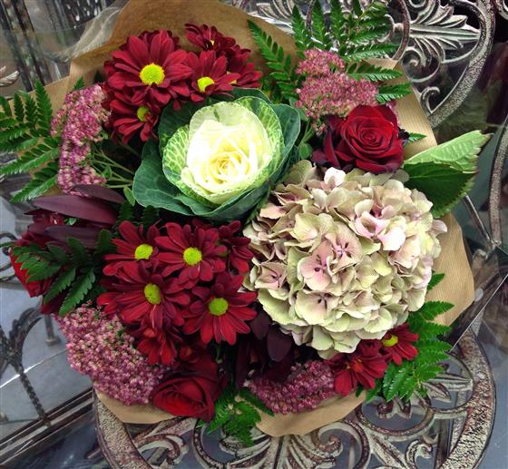 Red chrysanthemums and hydrangeas are the main attraction with this autumnal bouquet.