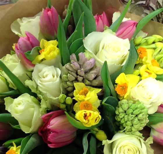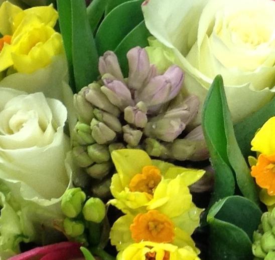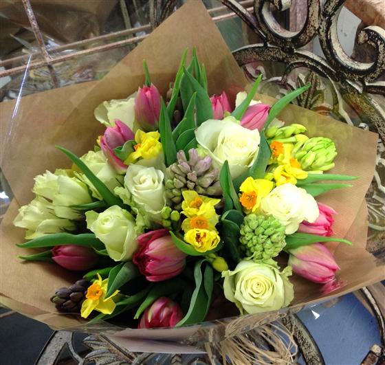 Spring scented bouquet with hyacinths, roses and tulips.