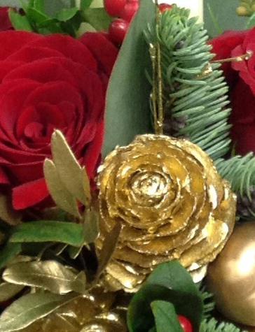 A single candle arrangement. Created using blue spruce, rich red roses, hypericum berries with golden cones and artificial apples.