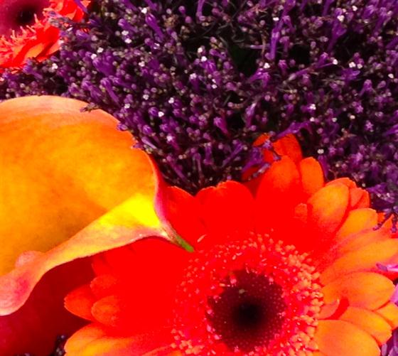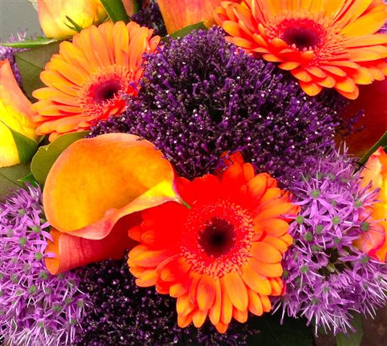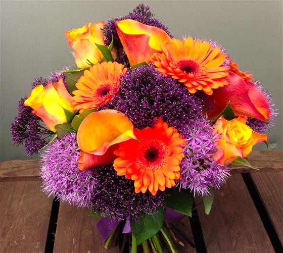A magnificent combination of purples and oranges including mango calla lilies, roses and mini gerberas.
