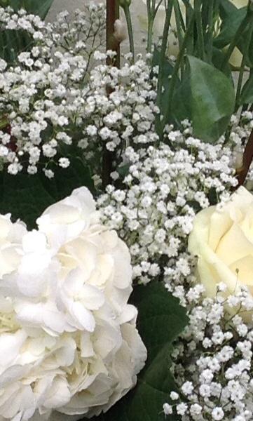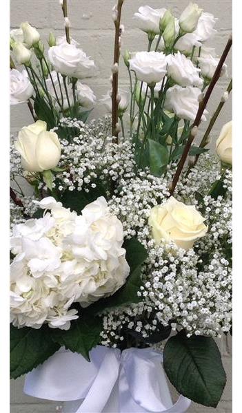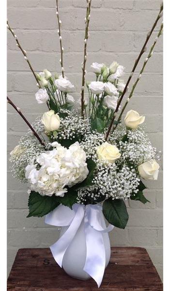 Stunning white vase display. Including white lisianthus roses hydrangea and gypsophlia.