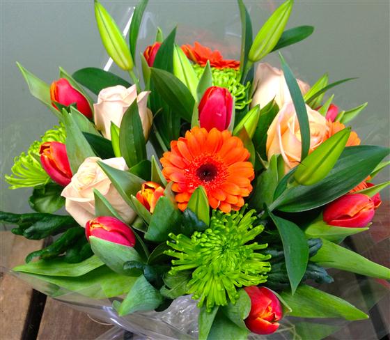 A cheerful mix of seasonal tulips, roses, scented oriental lilies and lime shamrock blooms.