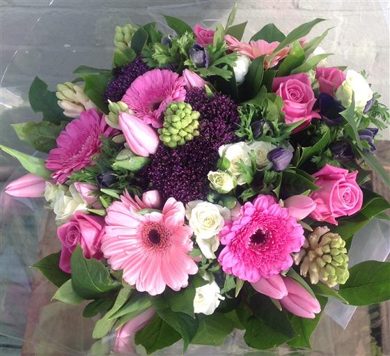 Lovely mix of pink and purple flowers including rose , gerberas and seasonal spring assortment