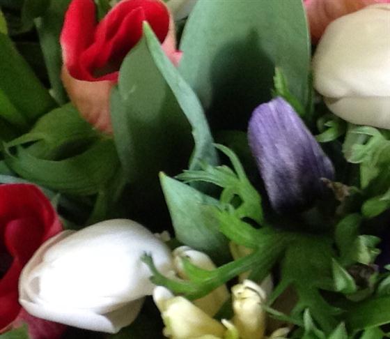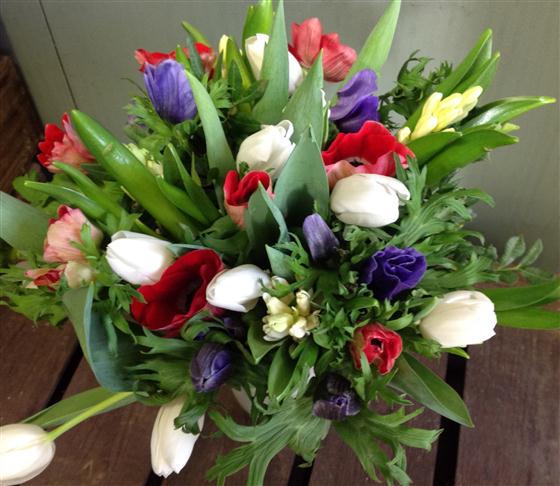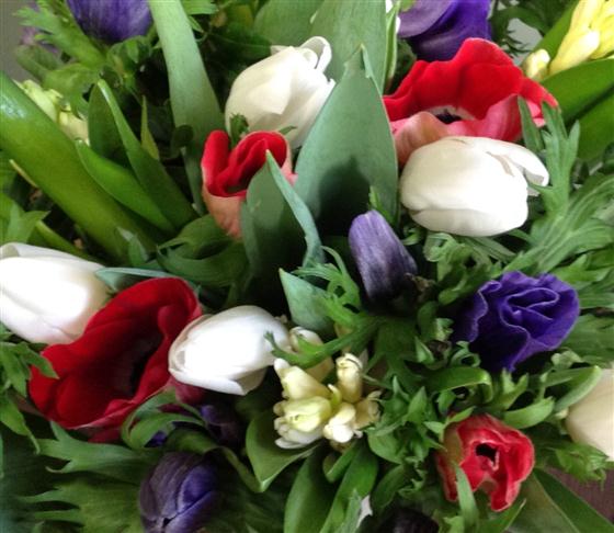 A true celebration of springtime, blue and red anemones contrast with simple white tulips and hyacinths.